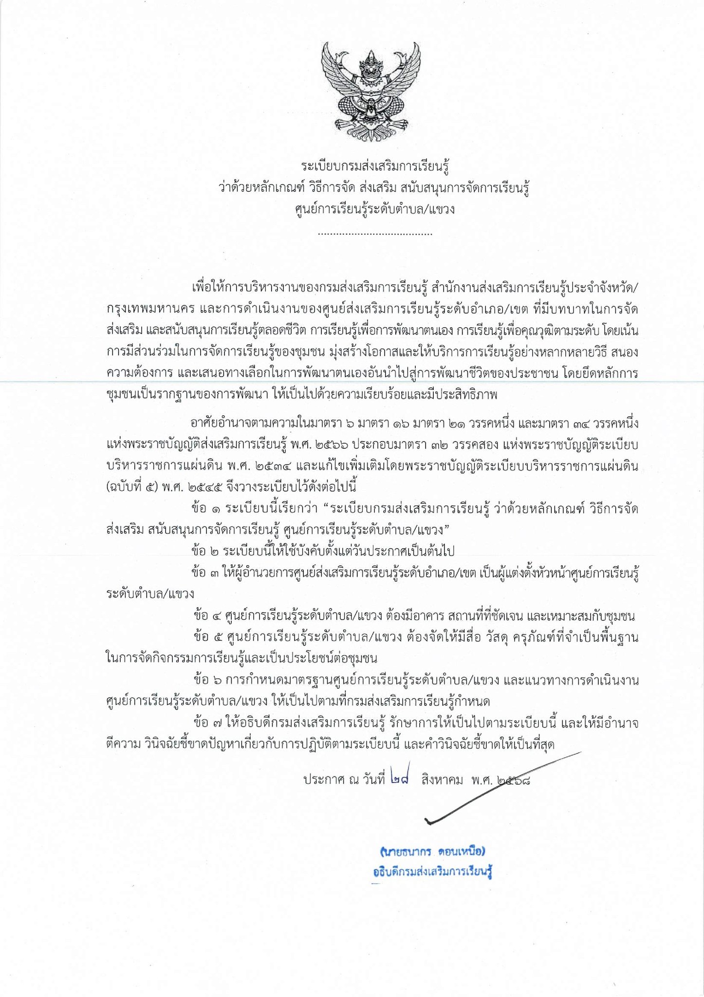 ระเบียบกรมส่งเสริมการเรียนรู้ ว่าด้วยหลักเกณฑ์ วิธีการจัด ส่งเสริม สนับสนุนการจัดการเรียนรู้ ศูนย์การเรียนรู้ระดับตำบล/แขวง |